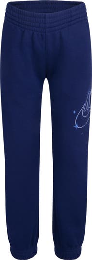 Sparkly stars and shiny logos illuminate a part of sweatpants made for kids who like to play and relax in the comfort of cotton-blend fleece.