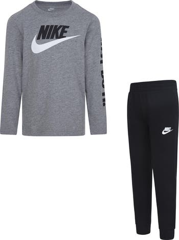 A lightweight jersey T-shirt framed by long sleeves is perfect for cooler temps while the matching fleece joggers complete their look.