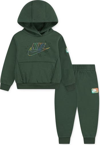Bold logo graphics brand a sporty set featuring a cotton-blend hoodie paired with classic, comfy joggers.