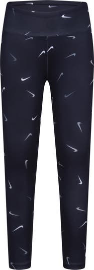 Moisture-wicking fabric ensures children stay comfortable during practice or play as they wear full-length leggings adorned with a confetti swoosh print.