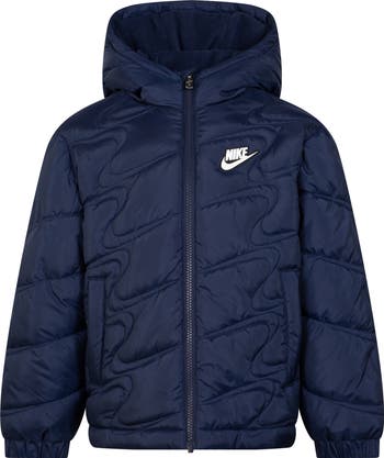 Swoosh-shaped quilting brings signature sporty style to this hooded puffer jacket that'll keep your kiddo warm all season long. A handy name tag insides makes it great for passing down from sibling to sibling for maximum value.
