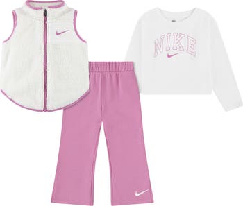 Nike's signature Swoosh motif defines each piece in this cold-weather trio of a layerable T-shirt, a fleece vest and flared sweatpants.