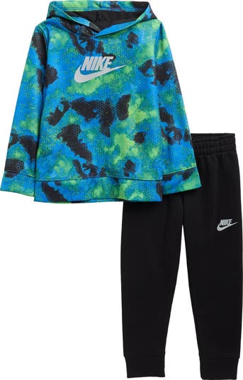 The brand's signature logo and Swoosh motif lend heritage style points to a sporty hoodie and joggers set that has your kiddo feeling ready to conquer gameday.