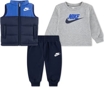 Keep your little one cozy with this 3-piece set featuring a soft long sleeve t-shirt, a warm zip-up puffer vest and comfy elastic-waist sweatpants.