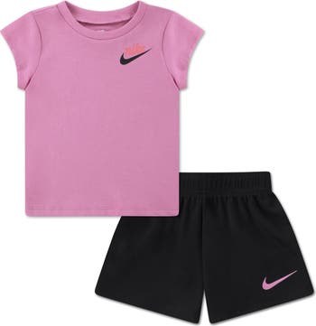 Soft fabric offers daily comfort for your kiddo in a sporty T-shirt featuring a signature swoosh logo and paired with breathable mesh shorts.