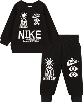 They'll stay cozy in signature Nike style in this statement set featuring a crewneck sweatshirt and matching joggers.