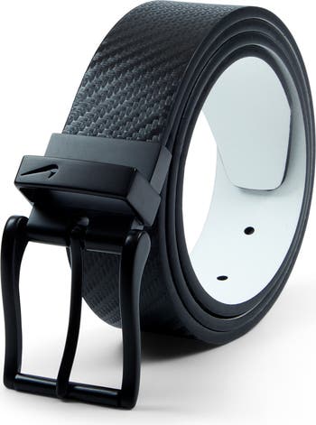 A sleek buckle secures this reversible belt crafted from two-tone leather for double the looks in one.