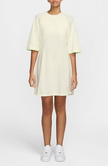 Wide and roomy raglan sleeves tipped with contrast update a go-everywhere T-shirt dress made from heavyweight cotton in a gently shaped silhouette.