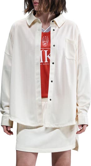 Dropped shoulders and a roomy silhouette create an effortlessly cool, slouchy fit in this zip-front shirt streaked with barely perceptible vertical stripes.