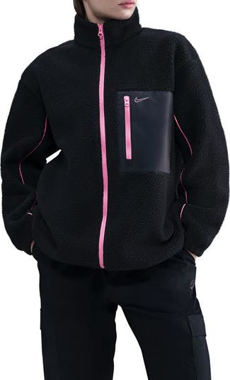Textured high-pile fleece keeps you supremely cozy out there while contrasting piping, an embroidered logo graphic and a satin patch pocket add sporty style.