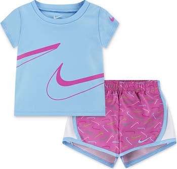 Soft fabric offers all-day comfort for your kiddo in a sporty T-shirt featuring signature swoosh logos and paired with breathable mesh shorts.