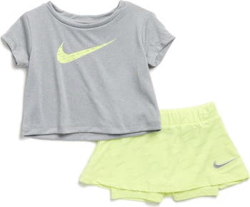 Nike's Swoosh motif brands the T-shirt and skirted shorts in this athletic set that has baby ready for gameday.