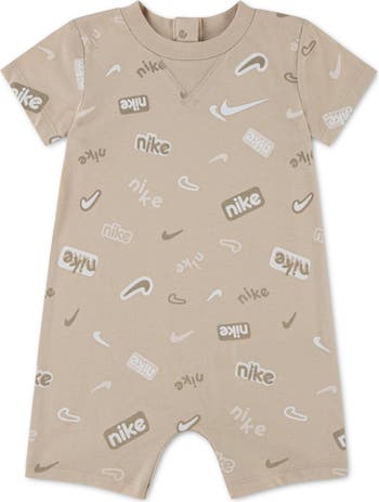 A soft cotton-blend knit keeps your little one playing and snuggling comfortably in a romper with signature swoosh print and convenient snaps for easy changing.