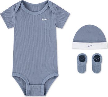 Offer head-to-toe comfort to your baby with this set featuring a cozy bodysuit, a matching hat and booties cut from a soft waffle knit.