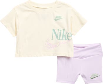 Your little one will look cute and sporty in this active set featuring a graphic T-shirt and matching ribbed shorts that keep them moving.