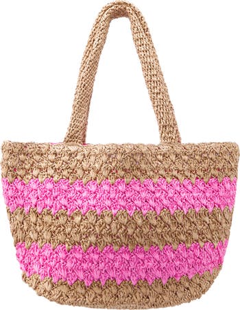 A basket-weave design streaked with contrasting horizontal stripes amps up the resortwear charm of this spacious faux-raffia tote perfectly sized for hitting up the beach with a paperback and some snacks.
