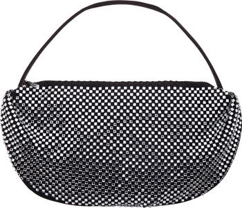 A mesh netting of faceted rhinestones lend shine to a halfmoon-shaped shoulder bag with a comfortable shoulder strap and gently gathered silhouette.