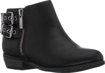 Buckled straps add a bit of an edge to a faux-leather bootie that your budding fashionista will love to style from classroom days to weekend outings.
