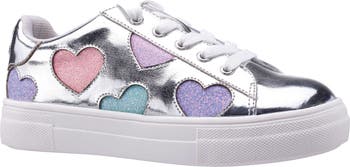 Shimmery laces and glossy hearts lend kid-approved flair to a low-top sneaker built with memory foam cushioining for a plush feel in every stride.