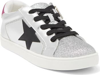 Glitter sparkles along metallic details on a classic low profile sneaker that features a bold star appliqué along the side.