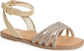 Shimmering rhinestones and a metallic upper add photo-ready luster to a kid-approved sandal set on a cushioned footbed and slip-resistant sole.