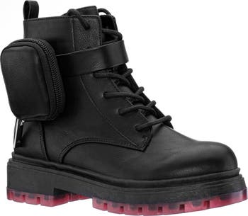 A soft pink hue on the grippy rubber sole brings a dose of sweetness to a combat boot shaped from smooth faux leather.