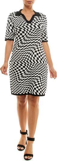 A mesmerizing checkered jacquard knit swirls over this elbow-sleeve dress made in a figure-hugging silhouette.