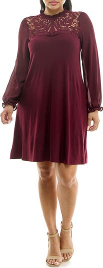 A floral guipure lace yoke graces a soft jersey trapeze dress fashioned with chiffon balloon sleeves and side-seam pockets.