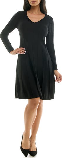 Wide ribbing textures a long-sleeve sweater-dress knit from soft, lightweight yarns in a charming fit-and-flare silhouette.