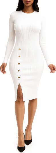 A long-sleeve ribbed sweater-dress offers sassy style in a body-con silhouette punctuated by gleaming faux buttons and a thigh-high slit.