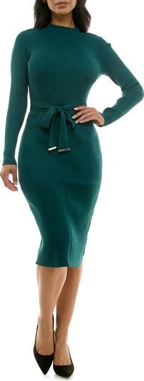 • Nina Leonard Waist Tie Ribbed Long Sleeve Sweater Dress