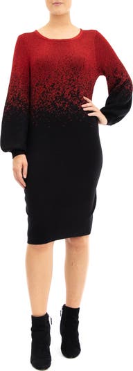 Colors fade from one to another on an ombré knit sweater dress that features dramatic blouson sleeves.