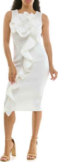 An oversized rosette makes a bold statement on the bodice of this sleeveless dress, accented by a cascading ruffle tendril that enhances its sophisticated allure.