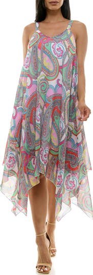 A handkerchief hem creates easy, effortless movements in a V-neck dress boasting a bold pattern for eye-catching appeal.