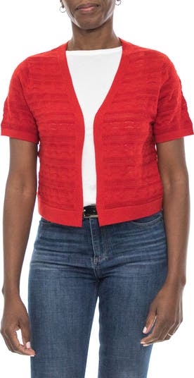 A lovely layering piece, this short-sleeve bolero is knit from soft, lightweight yarns and textured by airy pointelle stitches.