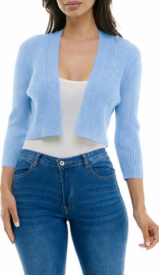 The perfect lightweight layering piece, this three-quarter sleeve cardigan is knit in a cropped, open-front silhouette with textural ribbed stitches.