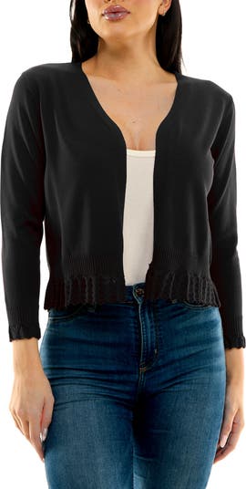 A lovely layering piece, this soft knit bolero is framed by three-quarter sleeves and dainty ruffles for charming style.