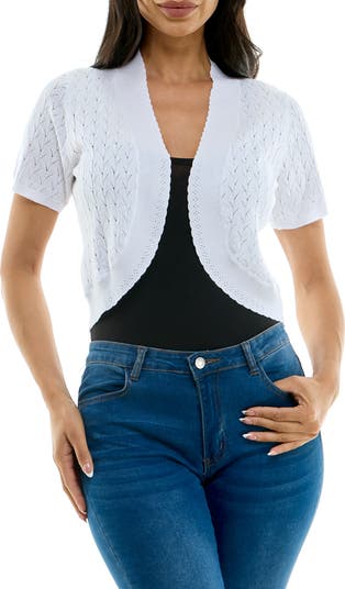 Pointelle stitching gives a trend-right look to a short-sleeve bolero edged in sweet scallops.