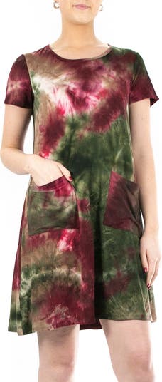 A tie dye print adds a casual style to this scoop neck, sleeveless dress with front patch pockets.
