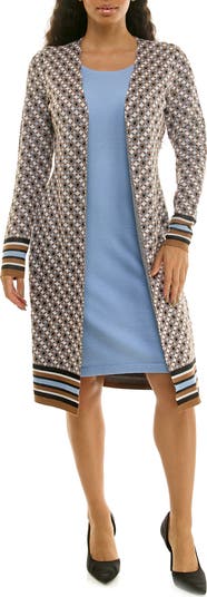 A jacquard cardigan adds a perfect layer of warmth to a signature shift dress that has you looking refined on desk-to-dinner days.