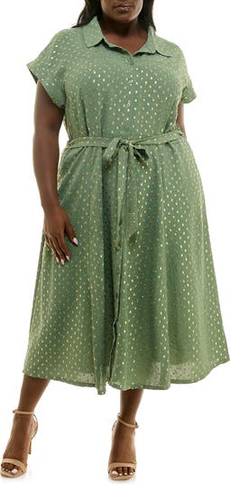 A metallic clip-dotted shirtdress cut in a graceful A-line silhouette features handy side pockets and a removable tie belt for utility-inspired style.