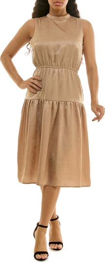 Perfect for your next weekend event, this sleeveless midi is cut from lustrous satin in a tiered silhouette.
