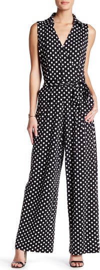 A distinctive print accentuates an eye-catching jumpsuit styled with a collared surplice neckline and waist tie for a chic desk-to-dinner look.