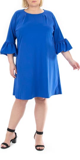 Frilly three-quarter length bell sleeves detail this solid woven shift dress that is a chic new addition to your night out style.
