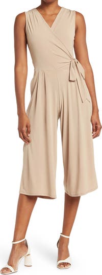 An abbreviated hem modernizes the look of a wrap jumpsuit crafted from soft and stretchy fabric for desk-to-dinner comfort.