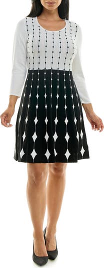 Reversed diamond jacquard texture defines a knit sweater dress with a fit-and-flare profile and a two-tone silhouette.