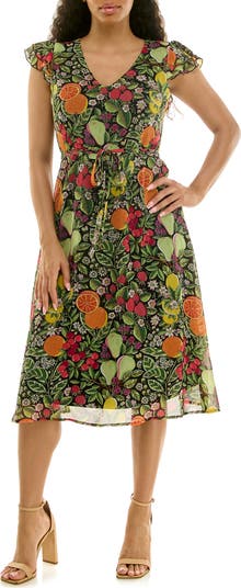 Elevate your off-duty ensembles with this flattering fit-and-flare dress finished with tiered flutter sleeves and a cinching tie belt.