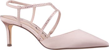 Rhinestones highlight the strappy silhouette of this satiny pump sharpened by a pointy toe.