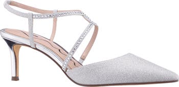 Rhinestones highlight the strappy silhouette of this glittery pump sharpened by a pointy toe.