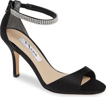 Nina black satin with rhinestone ankle strap heels